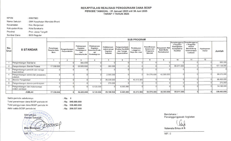 REKAPITULASI REALISASI PENGGUNAAN DANA BOSP TAHAP 1 TAHUN 2025 admin 2025-07-23 11:15:00 Rekapitulasi Realisasi Penggunaan Dana BOSP Tahap 1 Tahun 2025